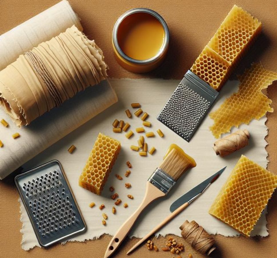For applying the beeswax, a brush or grater works well. If using a grater, shave the beeswax directly onto the fabric. Then, to melt the beeswax evenly, you’ll need a baking sheet and parchment paper or an oven-safe tray. Alternatively, an iron covered with parchment paper can be used to melt the wax into the fabric.